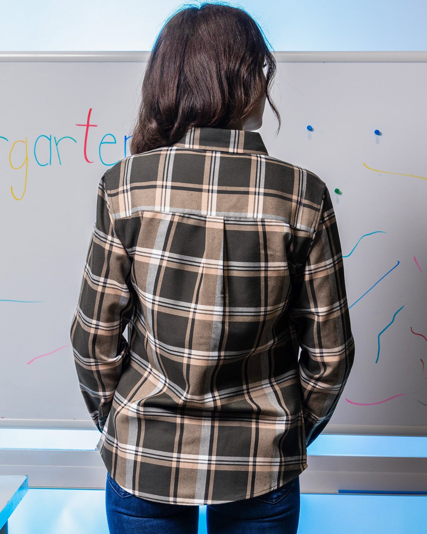 • Women’s brown, tan, and white plaid patterned flannel shirt
