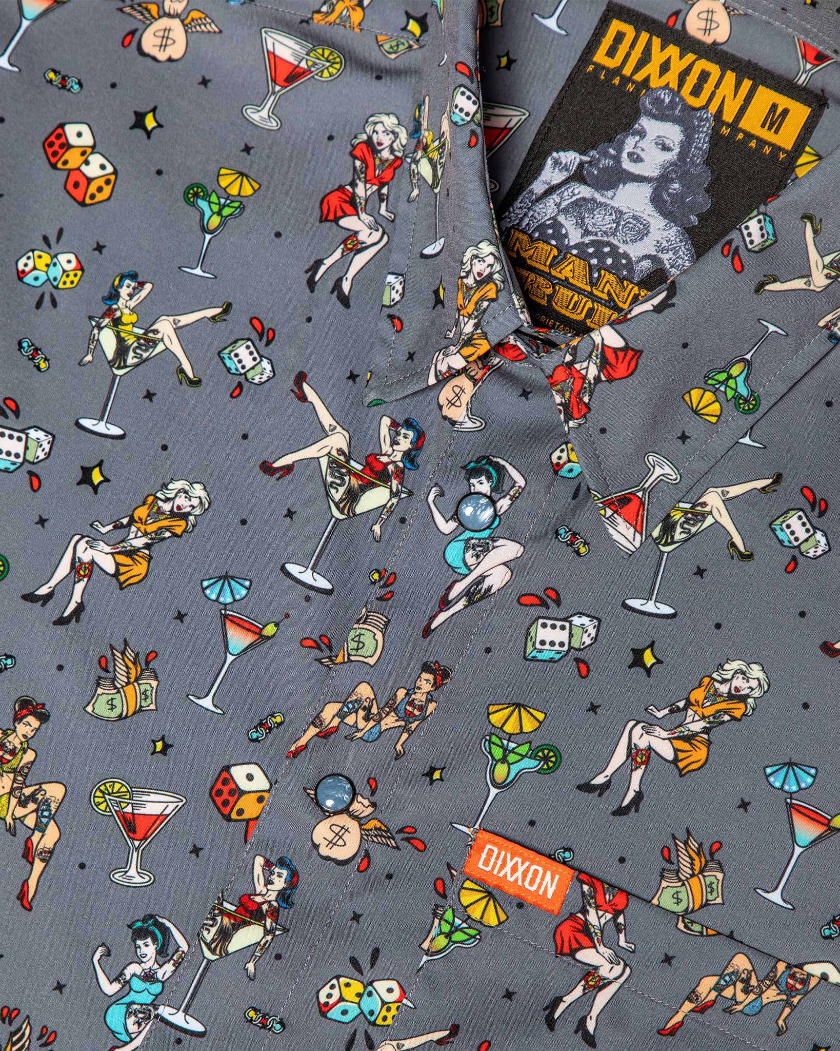 SHOP ALL BOGO GLOVESBold, playful, and a little rebellious, the Women’s Man’s Ruin Party Shirt brings vintage pin-up energy to a modern essential. Featuring a gray base with an all-over print of pin-up girls, cocktails, dice, and cash, this piece is made to stand out while keeping things effortlessly comfortable. Lightweight and breathable with a smooth finish, it’s ready for long nights and even better stories.